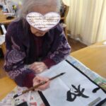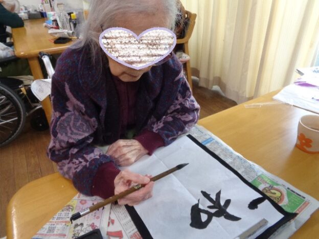 デイサービスでは、正月に書初めをしました。利用者の皆様は好きな言葉、願いを筆に込めて書初めをされました。
